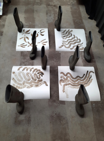 de laarzen uit hun wachtstand gehaald en in de ruimte geplaatst met het